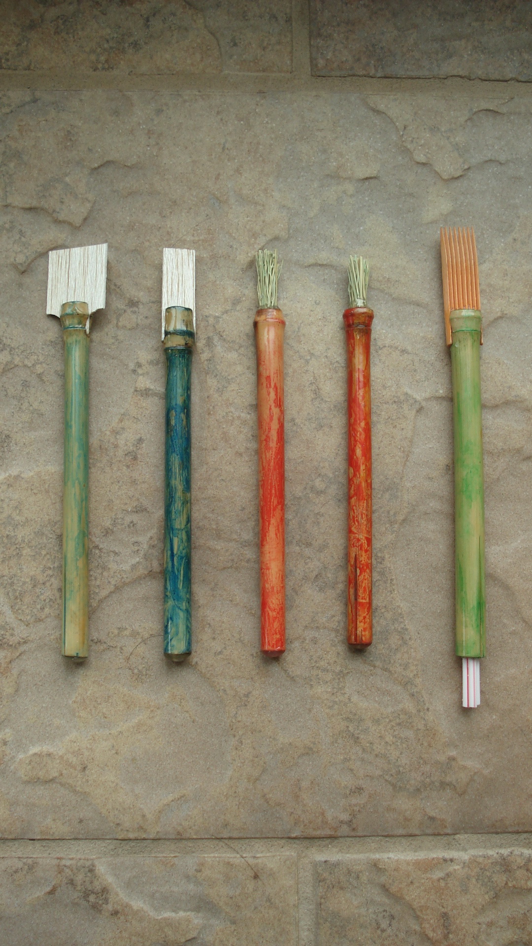 These are examples of several more mark making tools that I’ve been experimenting with. They all have bamboo handles that are painted in acrylic and sealed with polyurethane. Two of the nibs are balsa wood, two are bristle. The pen on the right has two mark making implements. One is a portion of wooden dental pick and the other side is made with cocktail straws with 1/8 inch slits in the ends.