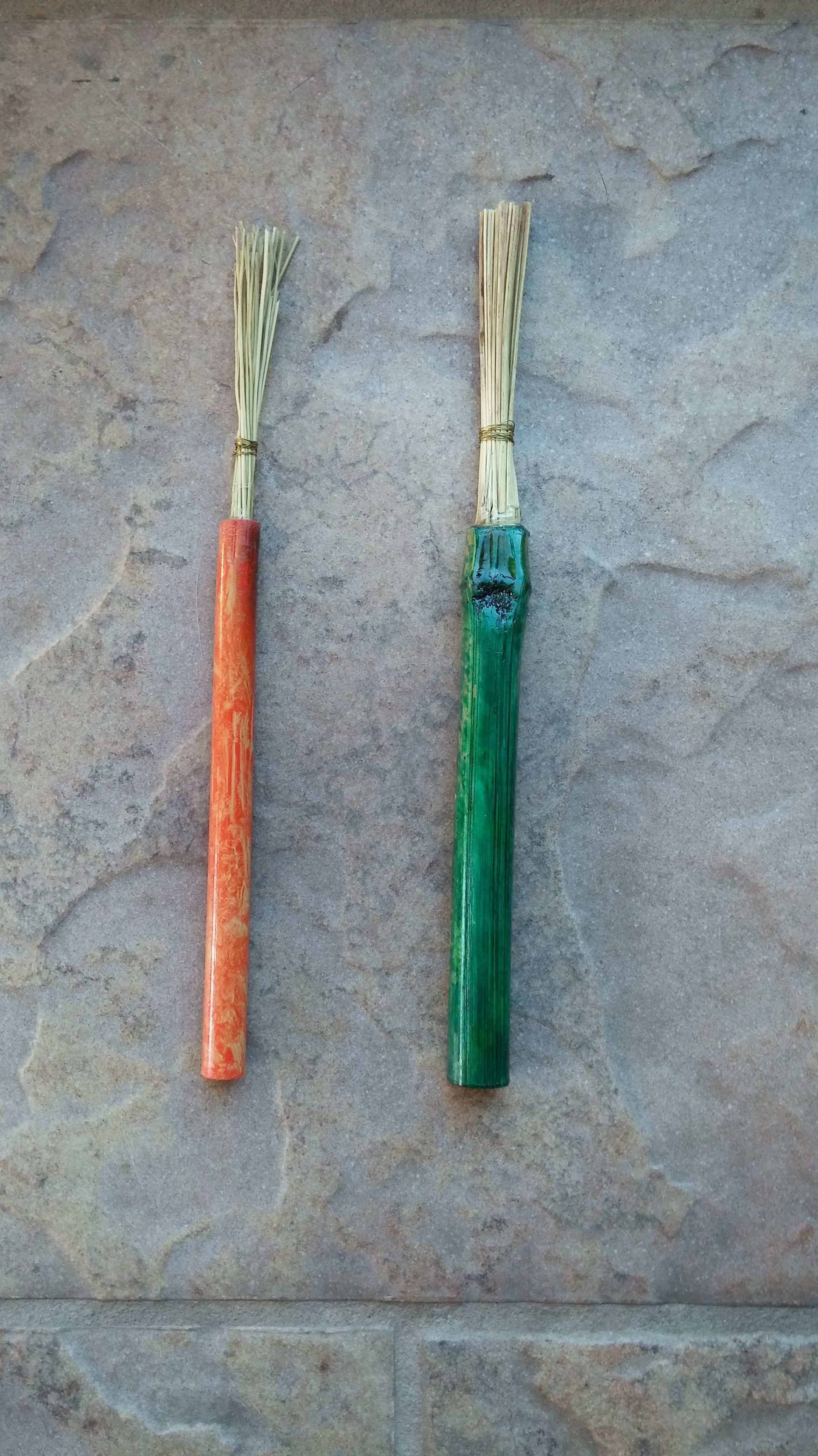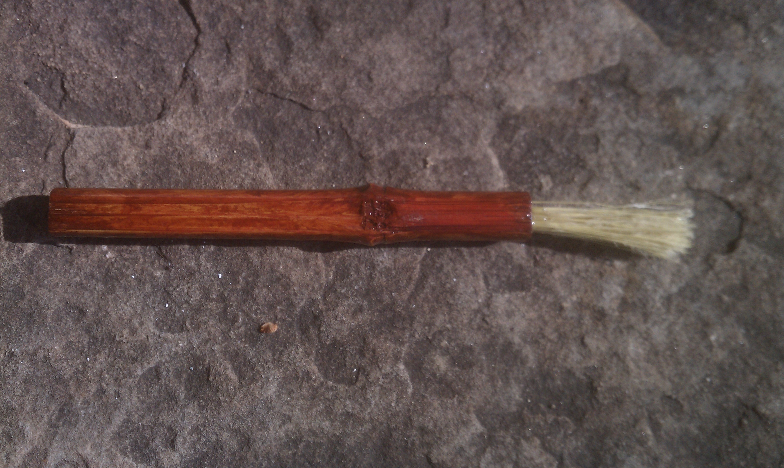 The brush on the left is a bristle brush with a more refined handle. Theoretically it can take more abuse and has a nicer appearance. The handle is bamboo which has been painted with acrylic and sealed with polyurethane. The bristles are epoxied into the handle.