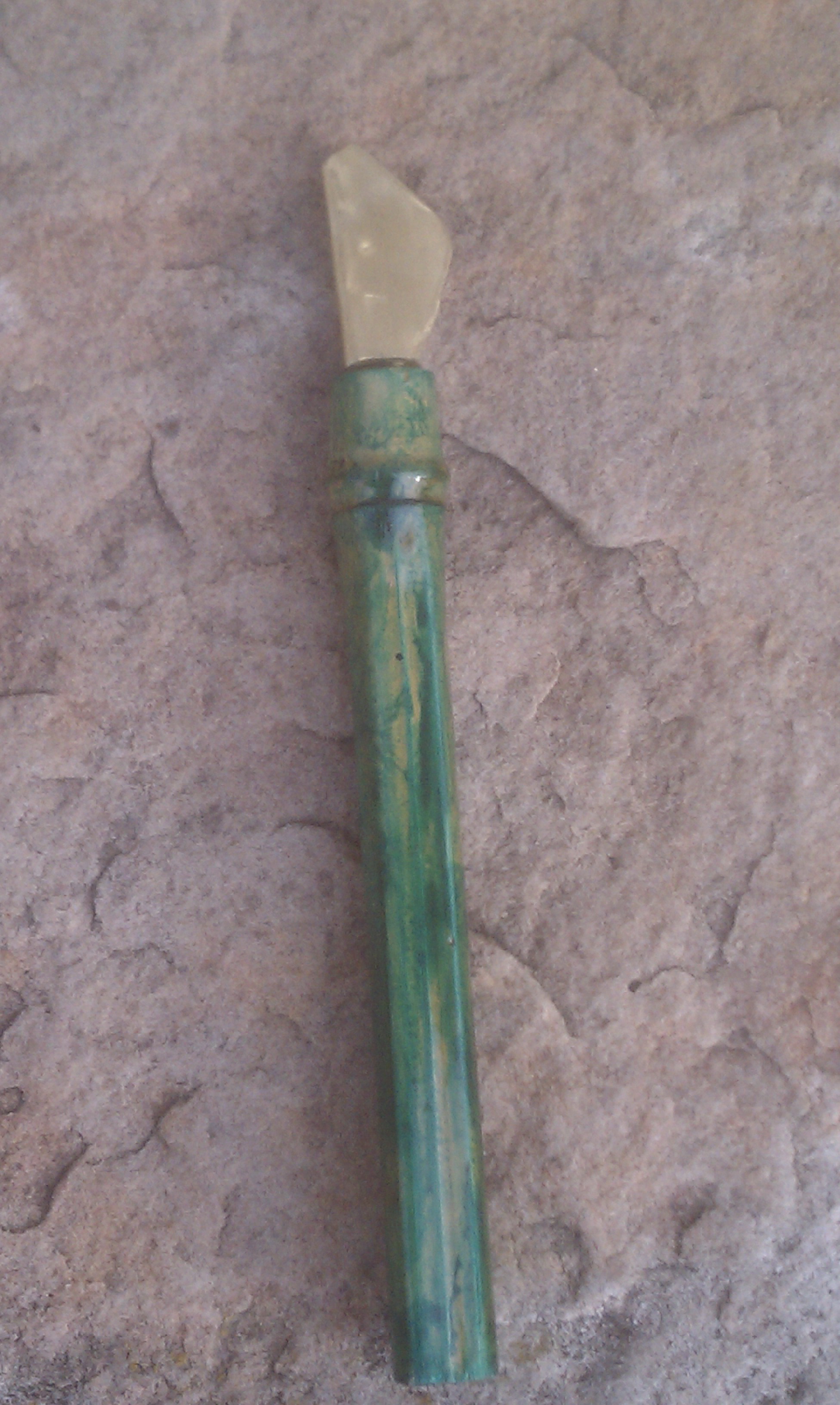 I remained intrigued about cola pens because I’ve seen marvelous effects created with them. So, I created a cola pen that is an inch long with a half inch shank. The smaller nib size seems to help the pens’ stability. I epoxied the nib into a bamboo handle to make it stable.