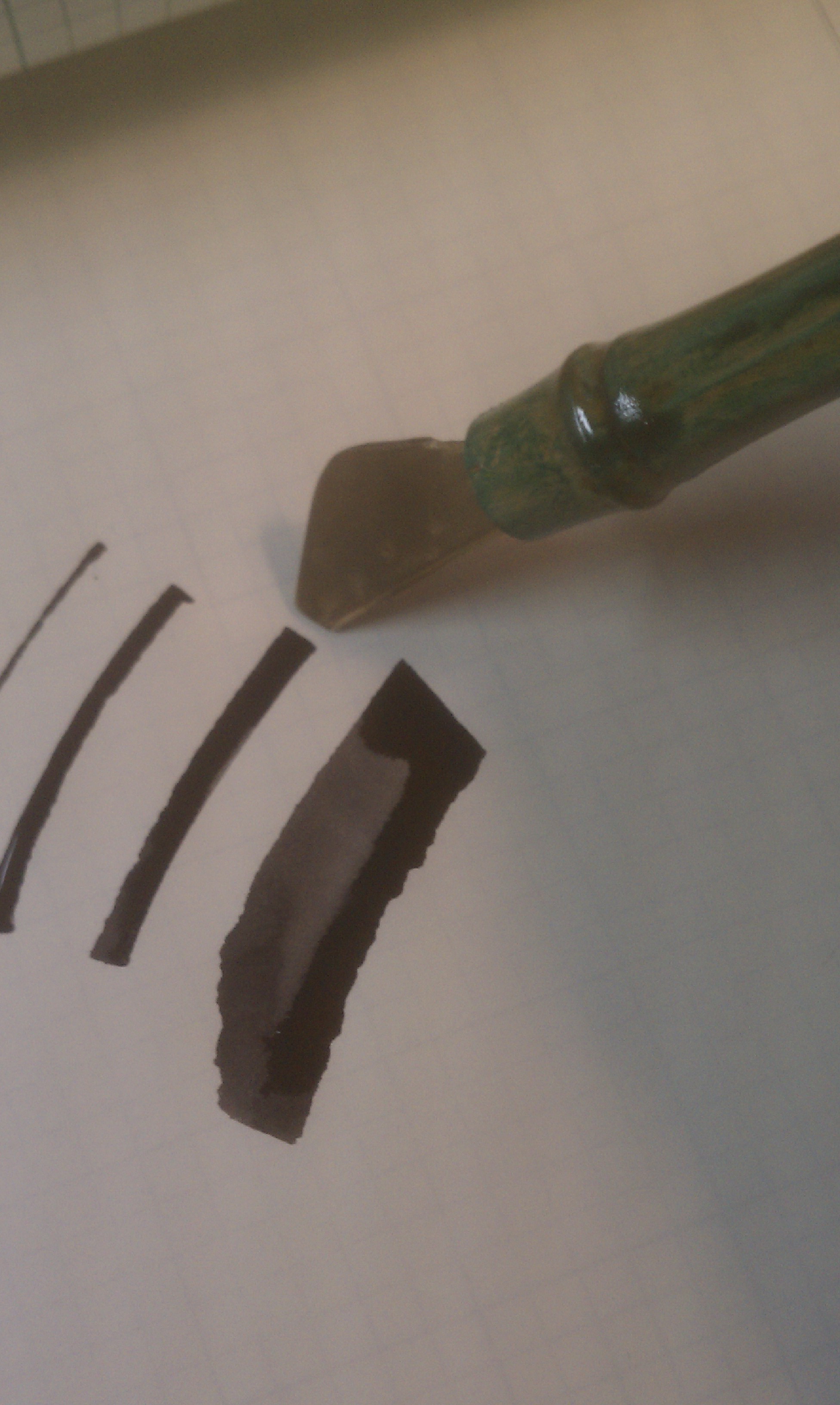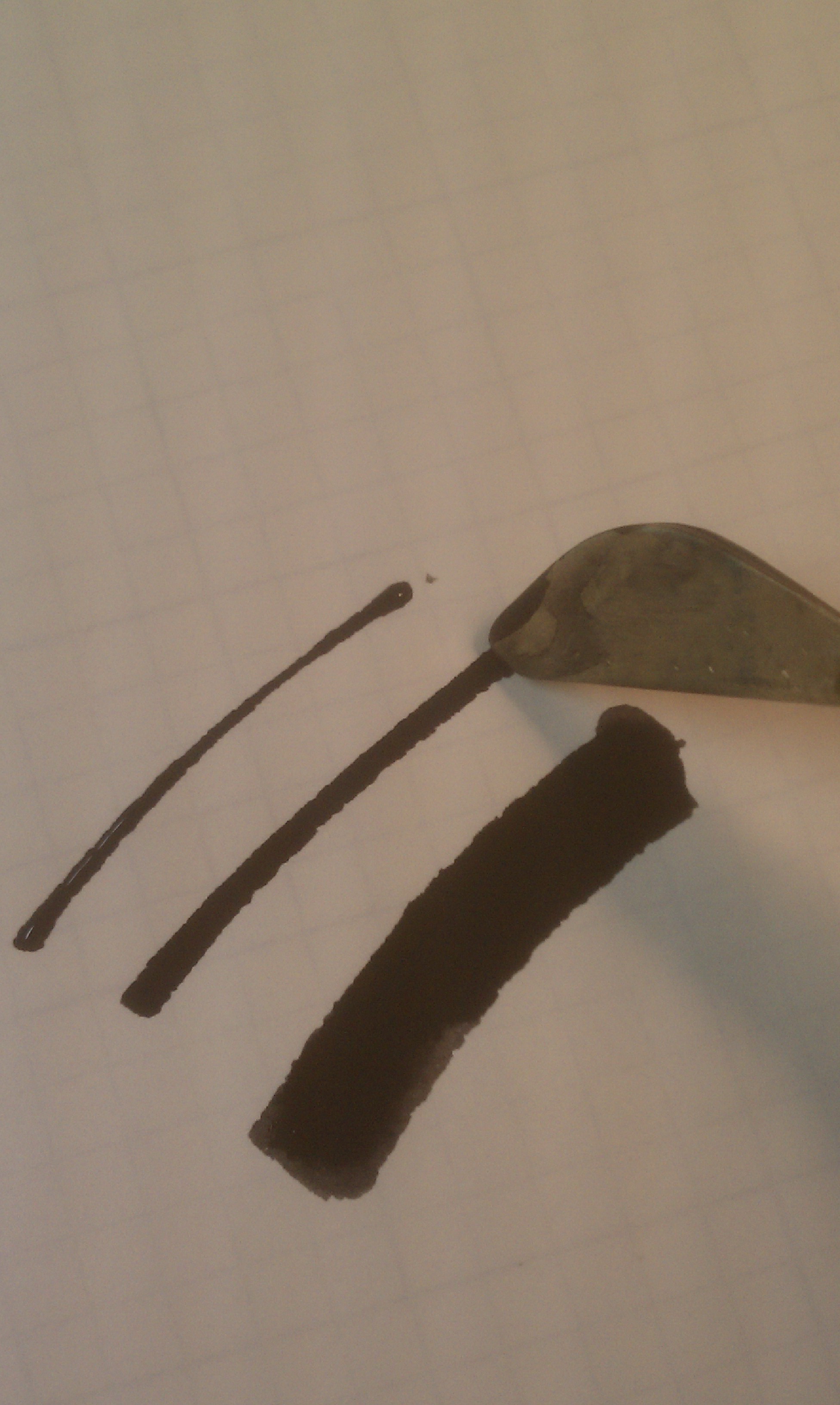 I have a lighter hand these days, I’m not the ape I once was, The nib no longer bends under my heavy hand. Using the rounded edge of the pen makes the nib chatter, creating some unevenness in the line and making a little spatter. Writing with the forward edge or the tip gives a more even, cleaner line. Now this is a fun tool.