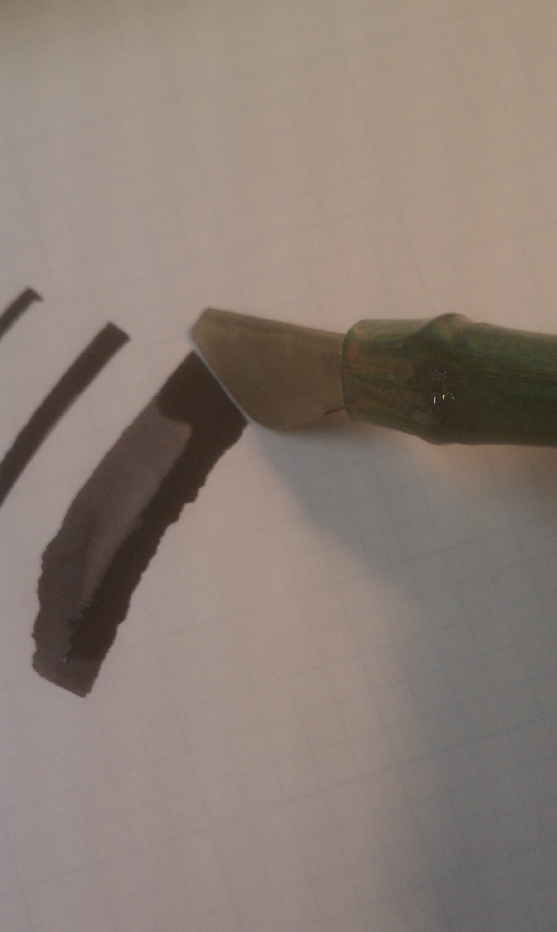 The pens actually have three effective writing surfaces as you can see from the following images. The hand-fabricated nibs are set into bamboo handles.