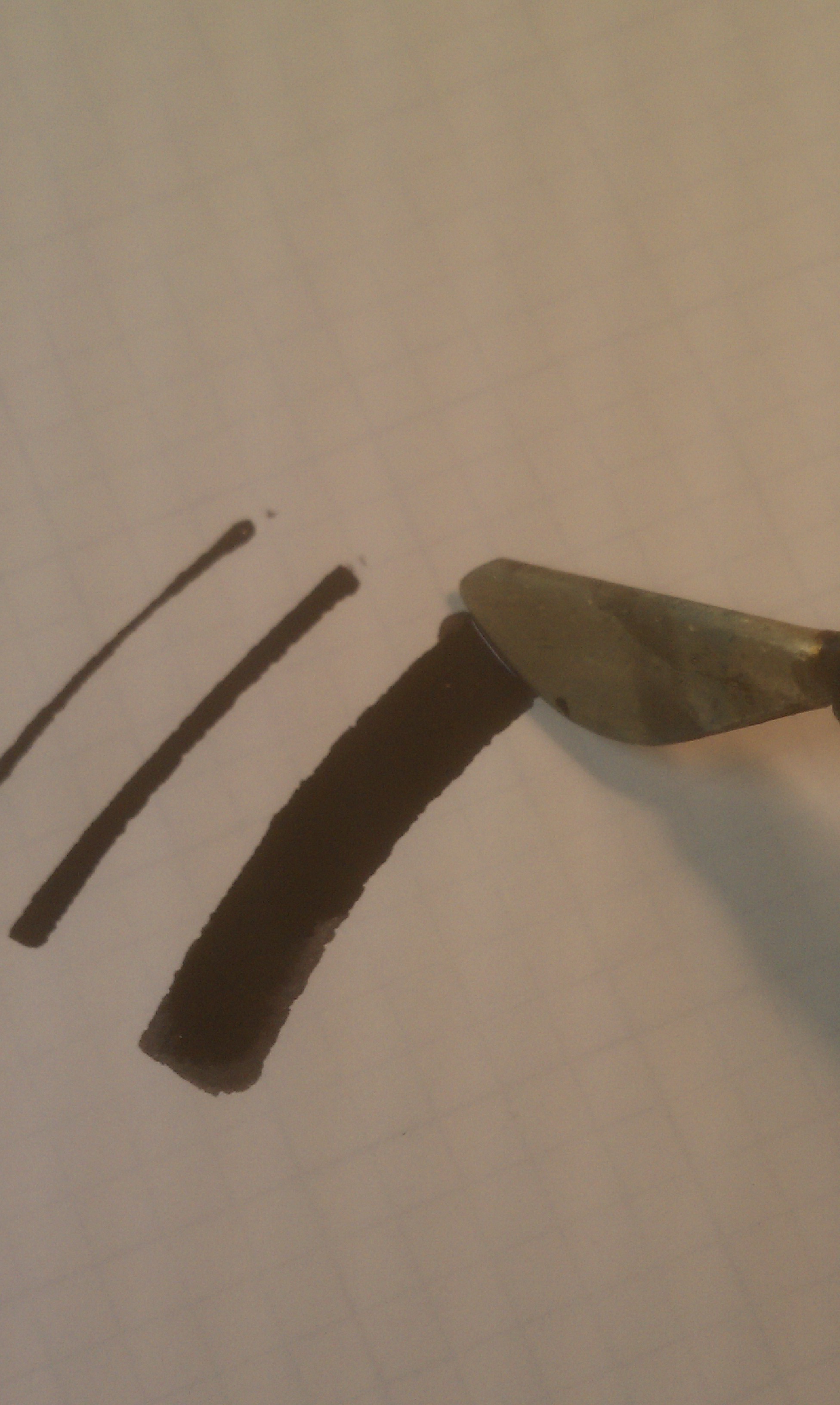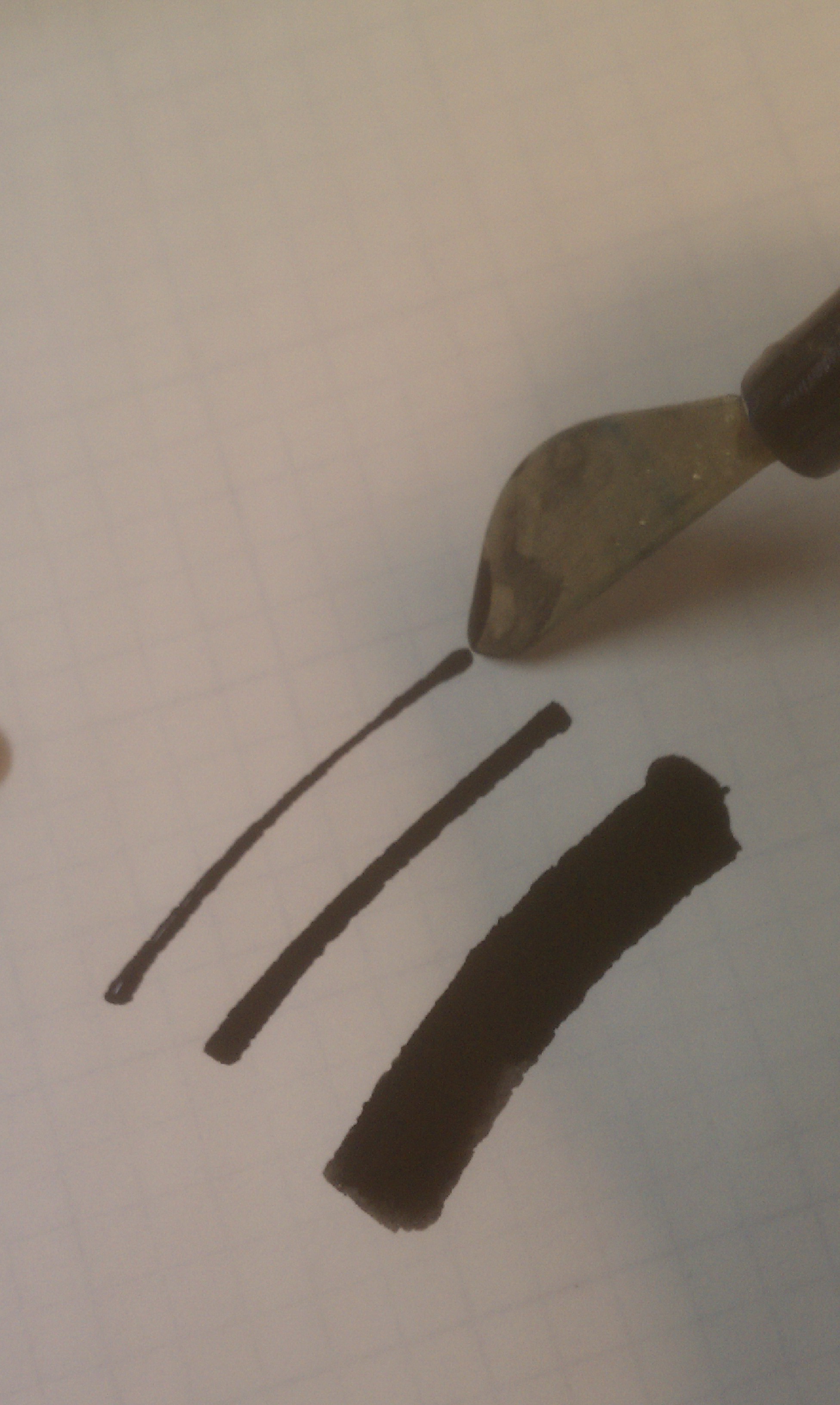 I am currently experimenting with the size of the reservoir. There is a theoretical limit of nib width vs. mark length vs. reservoir capacity. How big can the reservoir be without unloading the entire contents of the nib at once? How long can a wide line be and how long is long enough?